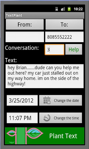 For anyone who’s ever felt the burn of getting caught, we’re pleased to introduce the Text Plant App for Google’s Android phone.Text Plant is the first app that allows you to go back and rewrite your text message history. This nifty app gives you the power to intervene your old text logs by inserting "to" and "from" text messages to any existing conversation in your phone and inserting them in any given date and time. Text Plant's name means exaxtly that! Type in your Text and Plant it wherever you want it to appear...